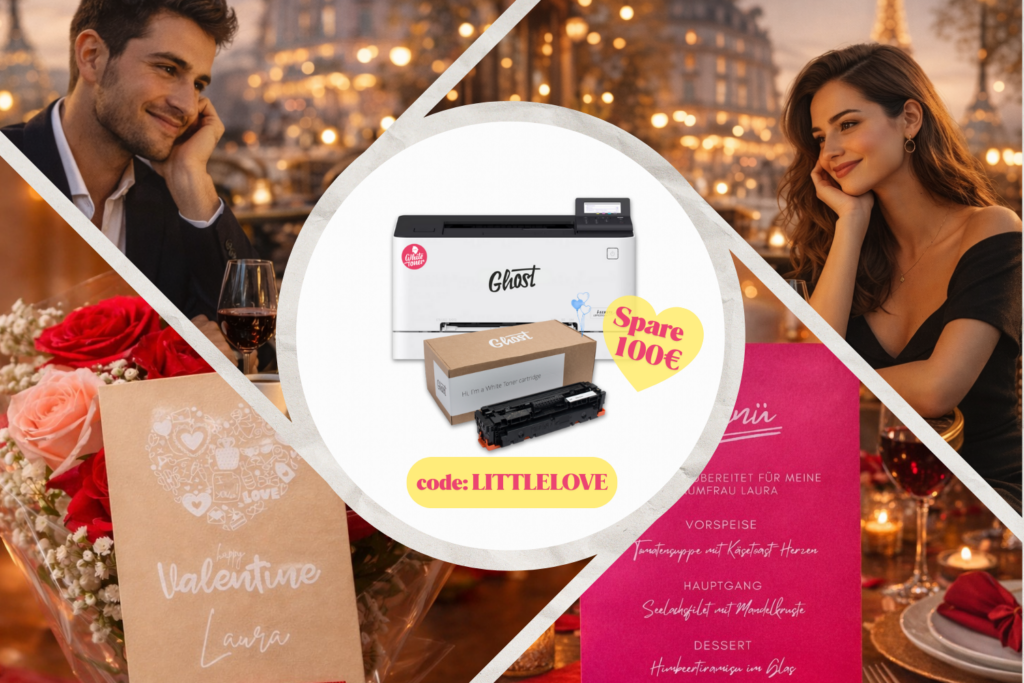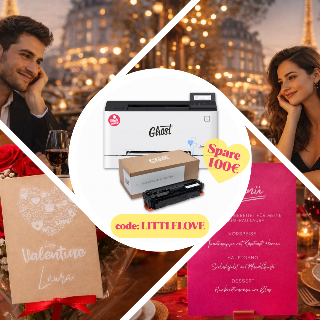 Hast Du erst noch vor, dich näher mit Weißdruck und seinen Möglichkeiten zu befassen? Wenn Du noch keinen geeigneten Laserdrucker besitzt, empfehlen wir Dir eines unserer Bundles. In den Big und Little Ghost Bundles ist jeweils ein Weißtoner für Weißdrucke auf Papier, Pappe etc. enthalten. Mit den Ghost Tonern kannst Du außerdem weitere Materialien im Transferdruckverfahren gestalten. Mehr Informationen dazu bekommst Du unten. Mit Weißtonern ergeben sich in vielen gestalterischen Zusammenhängen spannende Optionen, die besonders edle oder innovative Ergebnisse zutage fördern.